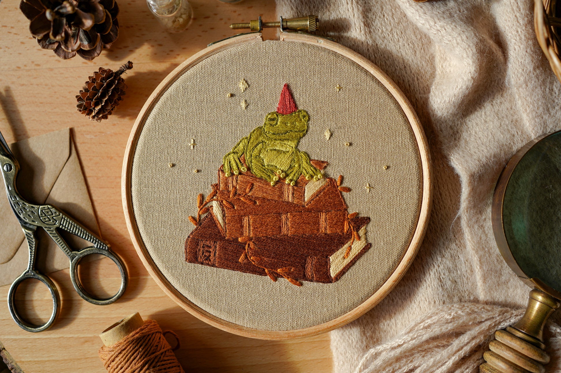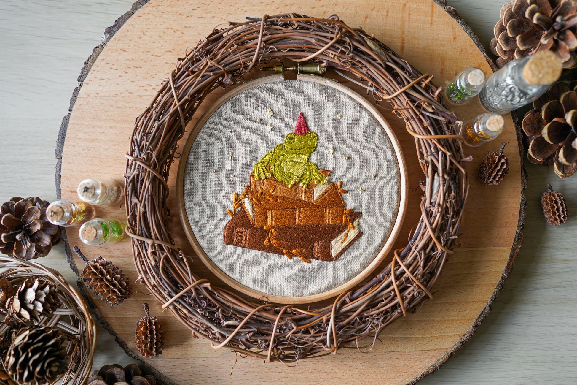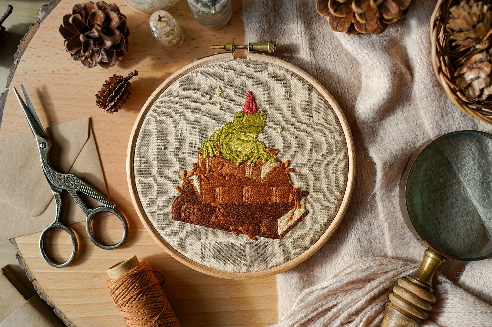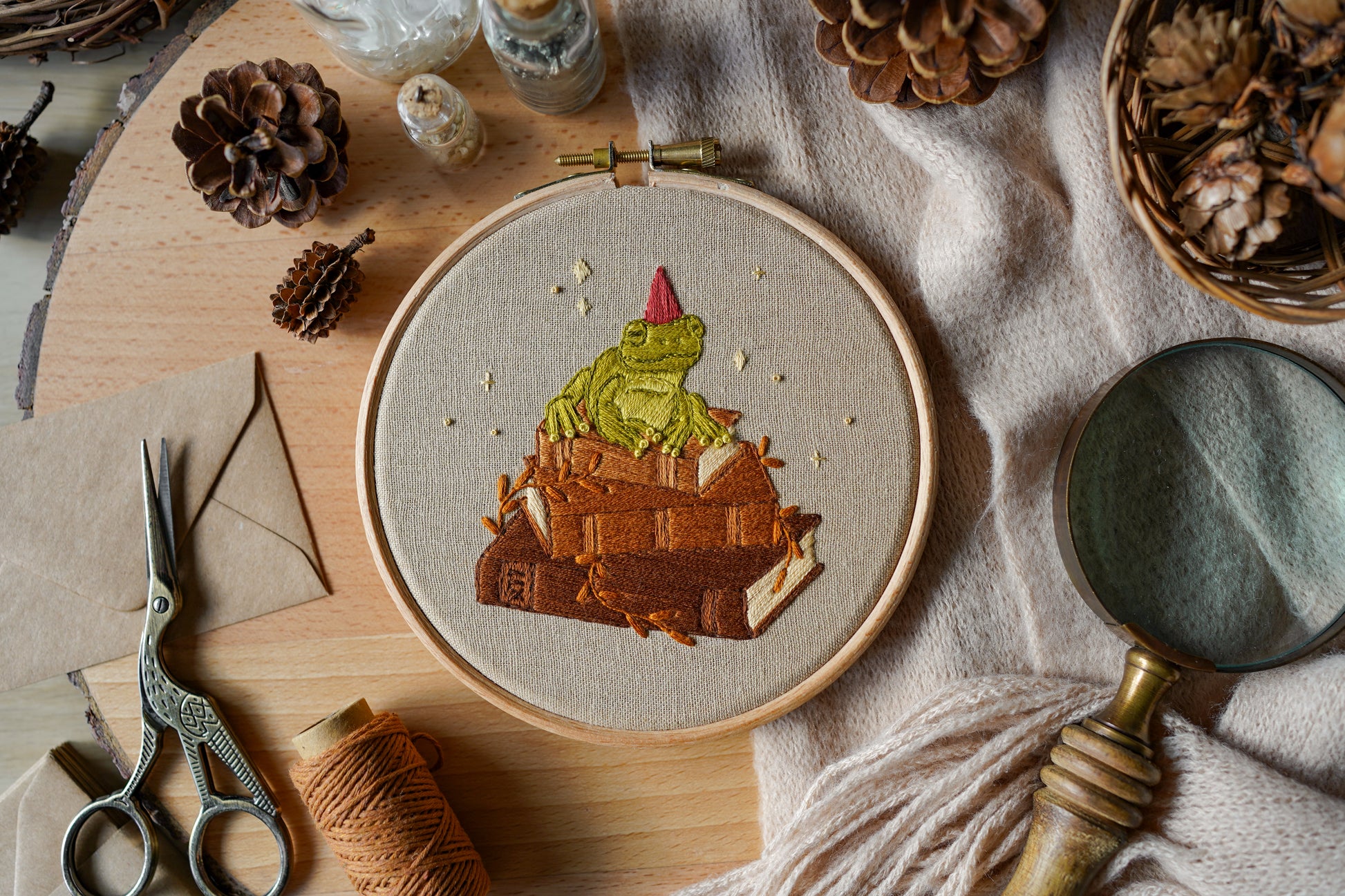This Frog Wizard embroidery pattern comes with a full stitch guide and is designed for confident beginners and above. It’s a cosy, whimsical design with warm autumnal colours. It features a cute frog in a red wizard hat sitting on spell books, surrounded by little sparkles.